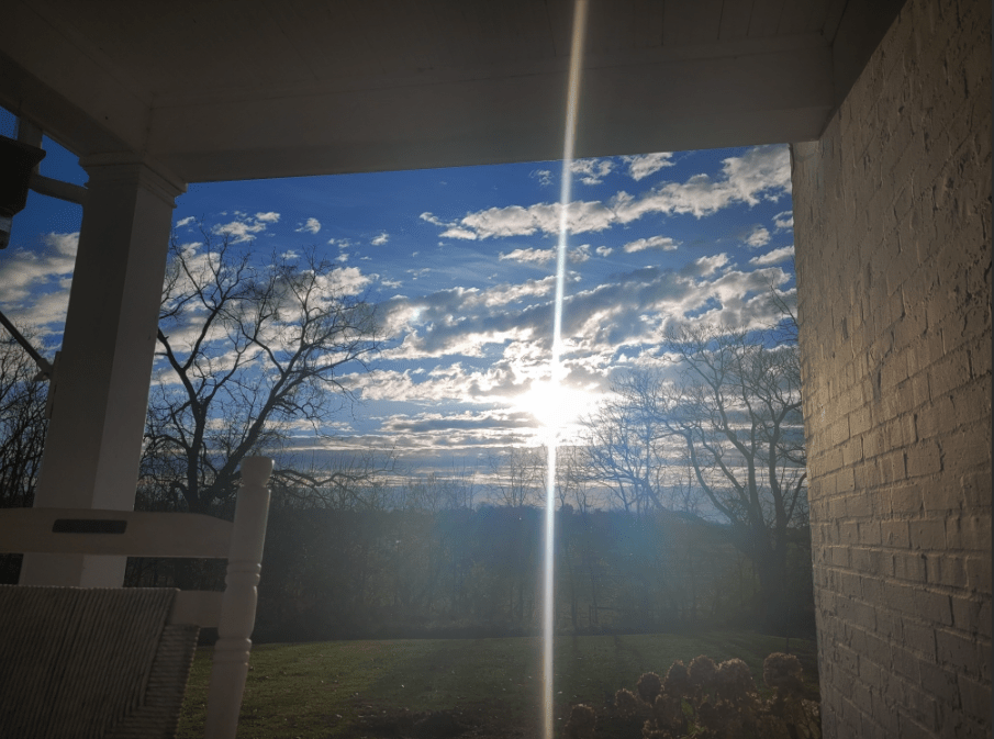 Good morning, world. Things are looking pretty good from the front porch of my farm in Virginia today. When I met with the Author and Perfector of my Faith to Nourish my soul for the day, it felt more like Spring than late Fall. I took in every ounce of the beauty around me as if I could store it all up to sustain me through the Winter…but it doesn’t work that way. The sun was warm on my face, and it felt more like May than November. I kept turning my face toward the sun to absorb all that I could while I still can before the winter cold shows up to stay as if I could bank it for another time…but it doesn’t work that way. When I opened my eyes to look at the sun that felt so good on my face, all I could see was a cross. I couldn’t snap a photo fast enough as if I was at risk of “losing” it if the clouds changed…but it doesn’t work that way. The reflection in the sky will come and go but the one Constant I can count on is the Cross and it’s what the Cross represents that keeps me going day after day. Isn’t that the way you look at the Cross too?