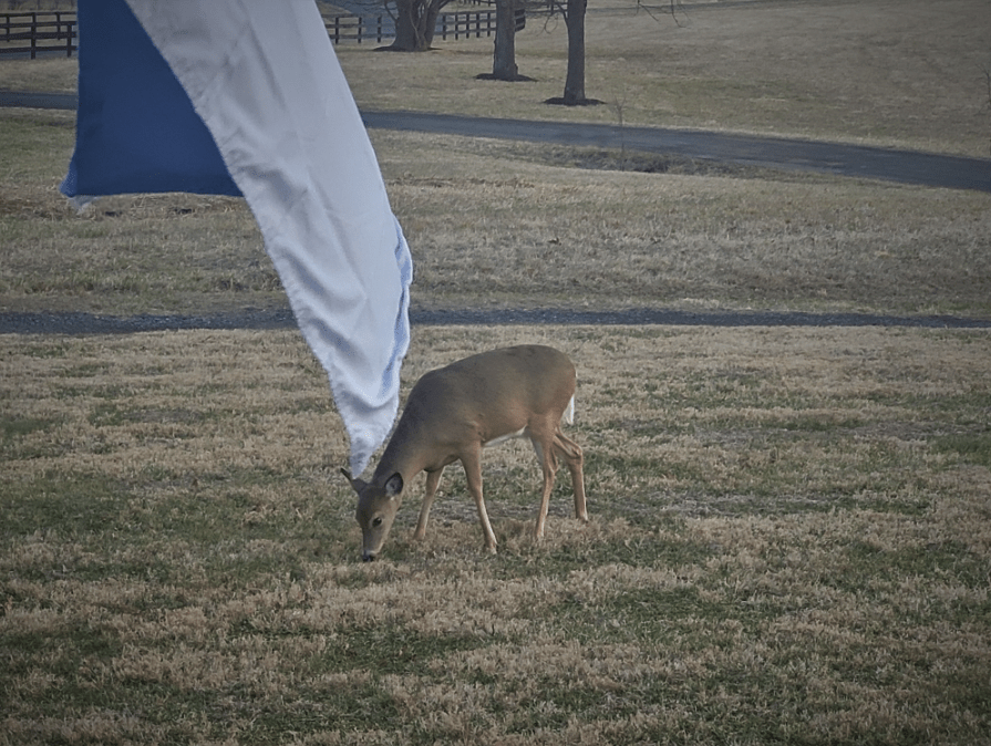 Good morning, world. Things are looking pretty good from the front porch of my farm in Virginia today. I met with the One Who died for me from inside the house looking out and I gave thanks for it all. I thanked Him for who He is and what He’s done for me. I thanked Him for choosing me to be His own. I thanked Him for making my Purpose clear. I thanked Him for my family. I thanked him for my health. I went on and on with all those things my Heart is thankful for and I never even got around to a request. He’s the Most Important thing in my Life and I want to make sure He knows it. As I sat at the window looking at this deer (seemingly) all alone and grazing on whatever there is to eat this time of year, I thought about how horrible it would be to NOT have God…to be knocking around through this life all alone and to NOT have the promise of a Future in Heaven. I considered how dark the world would be without His presence in it at such a time as this and it made me cry. Isn’t it just like my God to burn a Message in my Heart stemming from a photo of a simple deer?