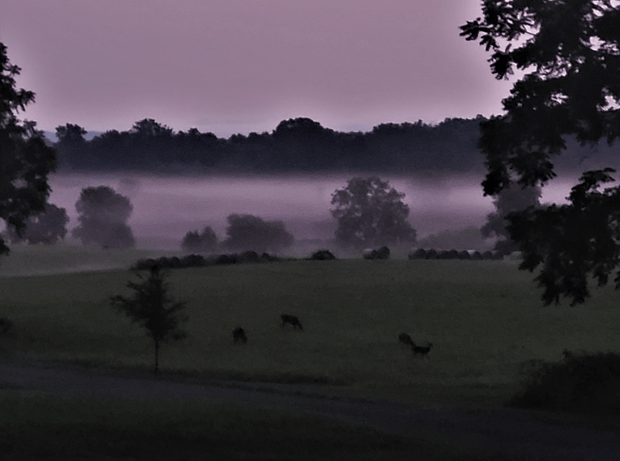 Good morning, world. Things are looking pretty good from the front porch of my farm in Virginia today. I stepped out onto the front porch with a cup of coffee in hand just as the sun was beginning to rise and I smiled when I felt the cool temperature on this July morning. The heat has been taking a toll on the earth and the land is thirsting for water. As I looked out at the foggy fields filled with deer eating their breakfast in the wee hours of this new day, I thanked God for the Beauty of the Simple things that bring such Joy to me. We’re all surrounded by Simple things that have the Potential to Fill the Heart with Joy and Gratitude, but not everybody is interested in looking for them because their Hearts are more inclined toward themselves and “feel good” moments. As for me, I’ll take the sound of a bird at sunrise over any concert on the planet, and I’ll take watching deer in the fields over any movie. God Entertains me more than man-made things ever could because I love the Simple things. This morning I spent a little extra time thanking the Living God for all that He is and for that He does for me and for this amazing clear and cool morning in Virginia. The Simple Pleasures make my Heart sing. Isn’t that the way it is in y our Journey of Faith too?