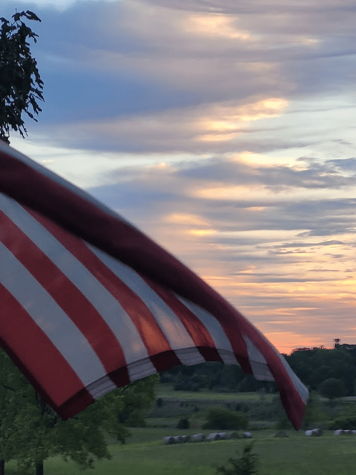 Good morning, world. Things are looking pretty good from the front porch of my farm in Virginia today. I’m Armed and Ready to face whatever comes my way today after a long time in the Presence of a Big God. These days I need more reminding than ever that HE IS THE CEO of the Universe and that He’s STILL in control of this dark world and everything in it. He always feeds me Comfort, Wisdom, and Love if I’ll just lean on Him. He is my Master GPS through this Journey called Life and He knows each turn I am to take, and when I am to take it. Despite the circumstances and what goes on in the world around me today, I am Strong, Courageous, and Fearless because I know that His Power is made PERFECT in my weakness! As surely as this flag flies boldly on my front porch as a symbol of respect and love for our country…even in its broken state…I’ll wave my Faith around for all the world to see and I will never give up until I draw my last breath. If I get knocked down I’ll always get back up. I wonder if the same is true for America today?