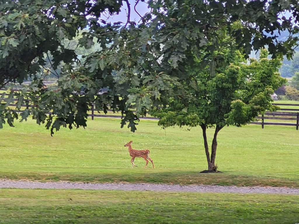 Good morning, world. Things are looking pretty good from the front porch of my farm in Virginia today. It’s that time of year when the morning air is cool but the sun is scorching, so my time outside is sometimes shorter than my Heart wants it to be. Before I headed inside out of the blazing sun, I was entertained by this little guy as it ventured away from its mother to play. Although she was grazing away for her sustenance, she didn’t miss a move, and I’m sure she would be ready to jump in should anything threaten her little one. Every once in a while the fawn would run back to check in with its mother and get a little sustenance from her. Right now it is totally dependent on its mom for food, but one day soon it will be ready to graze just like all the others. As the baby learns more and more about life and how to maneuver safely, it will soon become strong enough to make it on its own. Watching the deer dynamics, reminded me of how that’s the way it is in the Journey of Faith. As we learn more and more about our Father we become strong enough to make it through the Journey of Faith and we eventually trade milk for Real Sustenance. Isn’t that the way you see it too?